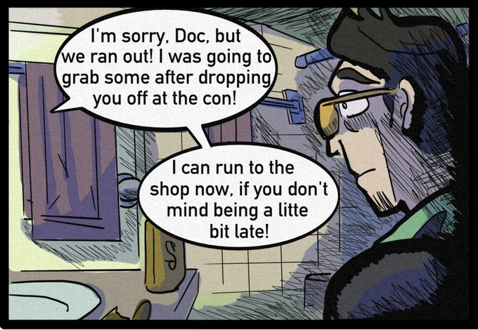 Doc Praxis hits the throne before a super villain convention, only to discover the toilet roll was not refilled!