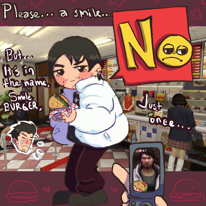hubby's playing yakuza k2 but we've been too busy dorking around w Daigo and Haruka too actually finish the game huuuaa 😄🍔 smile burgir... <3