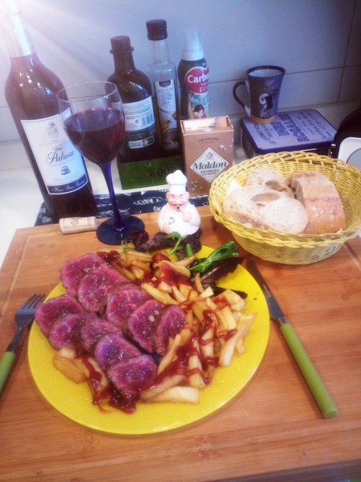 Lomo marinado en salsa teriyaki y salsa de mostaza con especias, con guarnición al gusto; todo ello bien regado con un tinto #RiberaDelDuero #ViñaPedrosa.
