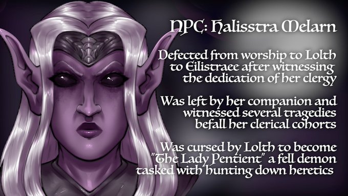 An illustration of an NPC and PC of my campaign. One was saved and the other one left behind by Eilistraee. Their interactions are amazing and the party is currently working in saving the one left behind. RTs and Follows appreciated <3