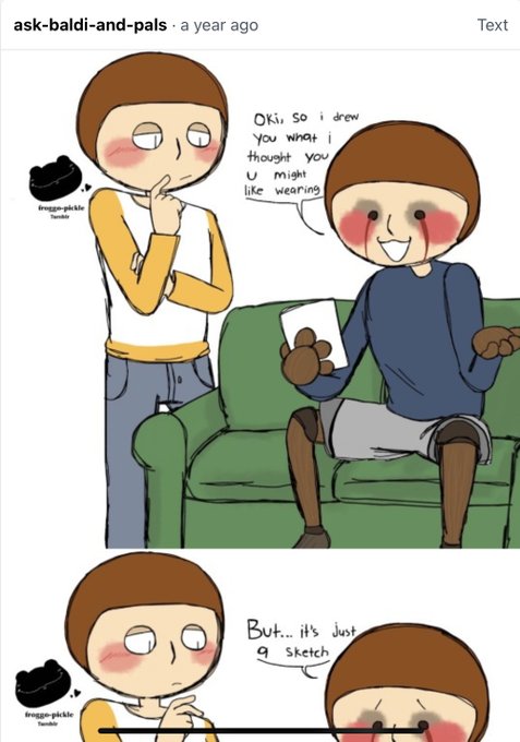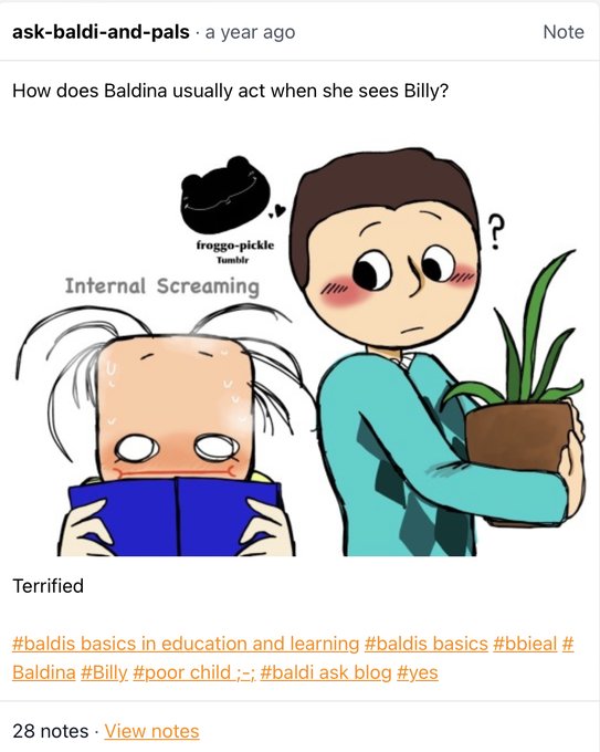 I was talking about ask-baldi-and-pals on tumblr, it’s a nice blog. I’m realising the way I worded the previous tweet makes it sound like I’m upset but I’m not, just cruious to see if anyone knew what I was talking about 👀 Some photos from the blog so you can familiarise