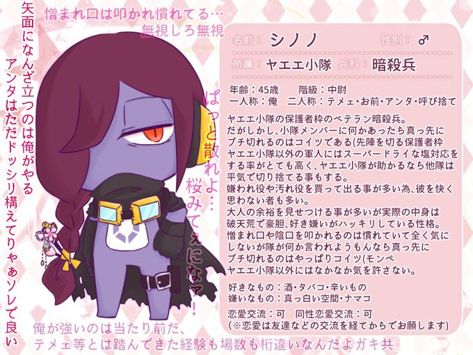 #FF小隊企画 #FF小隊企画CS ヤエエ小隊の保護者枠(モンペ)のオッサン暗殺兵です 小隊メンバー以外になかなか気を許そうとしないガードの固いオッサンですが、どうぞ宜しくお願いいたします( ˘ω˘ )