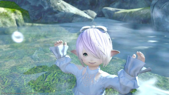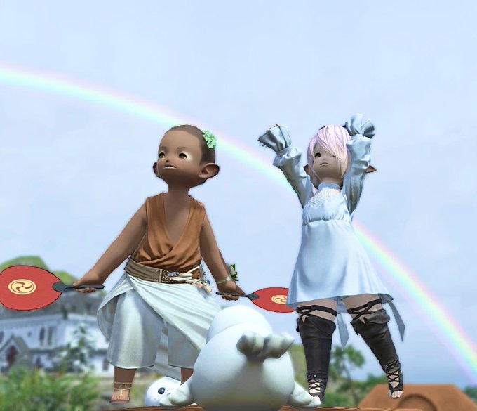 (*´∇`*)暑かった金曜日✨おつかれさまきゅ✨🌿 お兄ちゃんが水をかけるエモートくれたっ🐟ヾ(*´▽`*)ノ🐠お兄ちゃんとアザラシにかけてあげたきゅ〜 シロガネの虹も🌈気持ち良さそう(*゚▽゚)ノ🐠 みなさんが涼しくなりますように🌿 #おつララ #FF14虹