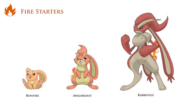 Everyone seemed to like the last Fakes I did so much I thought I'd do my next lot. Might tweak Angoroast in the future (and think of a better name) but I'm really happy with the other two :) #Pokemon #Fakemon #Rabbit #Firestarters