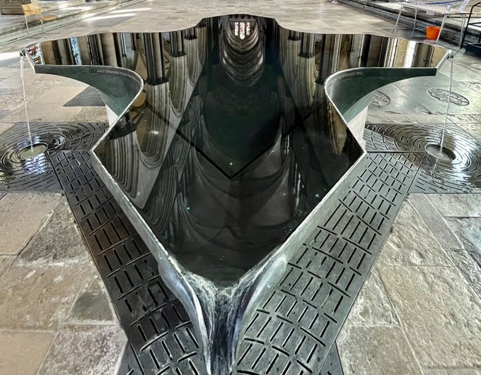 Medieval reflections. The font at Salisbury Cathedral, designed by the sculptor William Pye. The font was installed in 2008, the first permanent font in the Cathedral for over 200 years. @SalisburyCath #FontsOnFriday