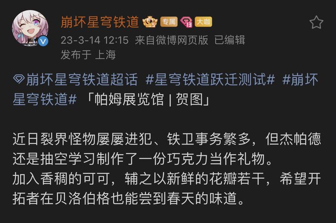 Recently, invasions by Fragmentum monsters have been more frequent, making the Guards more busy but Gepard still took the time to learn how to make chocolate as a present. Adding fragrant cocoa and several fresh petals, hopefully Trailblazer gets a taste of Spring in Belobog.