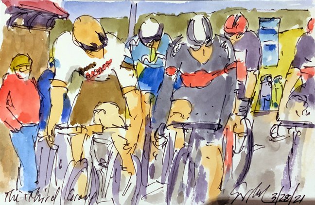 "The Third Group" @GregVanAvermaet @AG2RCITROENTEAM leads the chase of the 3rd group, more #GentWevelgem #cycling #art #watercolors at https://t.co/4j6uLsXUV0 #cyclisme #ciclismo #wielrennen @flobikes @GentWevelgem
