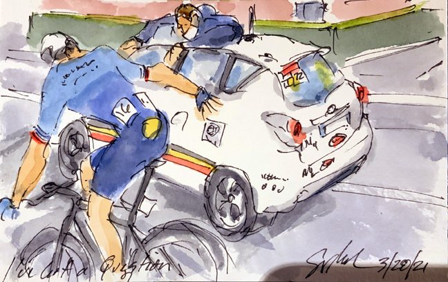 "I've Got a Question" @zdenekstybar @deceuninck_qst checks in w/ @GentWevelgem race commissare before dropping back to the team car. More #GentWevelgem #cycling #art #watercolors at https://t.co/4j6uLsXUV0 #cyclisme #ciclismo #wielrennen @flobikes
