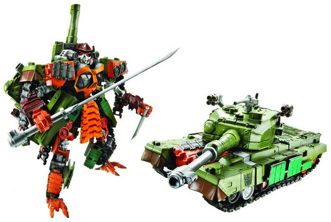 Timelines "Gigatron" (trademark reasons) is a redeco/retool of Revenge of the Fallen Voyager Class Bludgeon, sporting a new head. Gigatron transforms from a Japanese Type 90 tank.