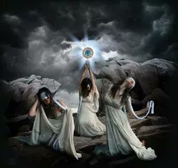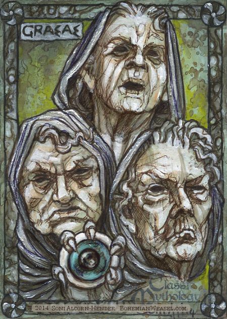 #FairyTaleTuesday In Greek mythology the #Graeae are sisters, three old women, known as “the grey ones”. Born grey, their most obvious physical feature was that they had but one eye & one tooth between them, which were passed around the three.