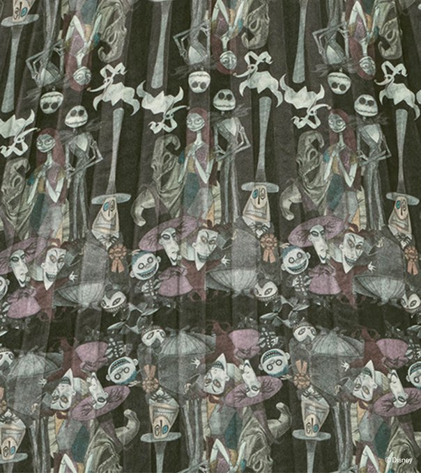 ジャック、サリー、ゼロ、メイヤー、ロック、ショック、バレル、ヴァンパイア・テディが集合したデザインをパターン柄にしたダークで雰囲気のあるスカート。ウエストはゴムです。