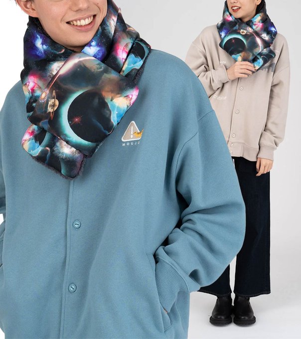 惑星ネコに超新星爆発から飛び出す子猫。宇宙の神秘を感じる、雄大なネコネコ銀河を描いた《インザギャラクシー》。中綿入りマフラーの内側に肌触りが良いボアを使用しているので、首元をしっかりと包み込みます。