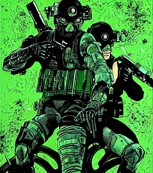 "Splinter Cell Death From A Green And Black Toxic Desolate Future With Pain And Suffering In A Comic Colored Pen Style Detailed painting by Harr Garrison and Tomo Chalne." 💚🖤