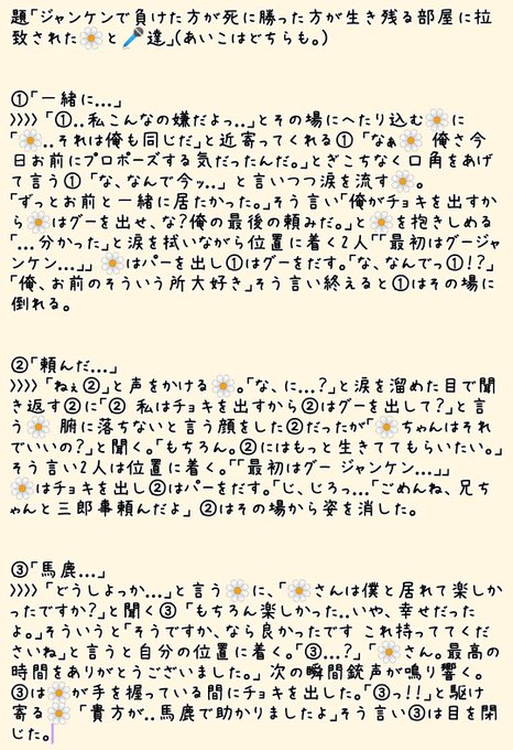 題「ジャンケンで負けた方が死に勝った方が生き残る部屋に拉致された🌼と🎤達」 (あいこはどちらも。) ※死ネタ注意です。 誤字脱字がありましたら教えて貰えると嬉しいです🙇 #hpmiマイナス #hpmyマイナス #hpmy夢