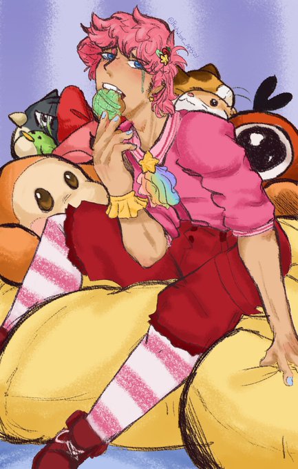 Finally! I've settled on a good design for #humankirby ! Too bad it was bad brain day though and I had to make him cry and eat his feelings out with sweets 😅