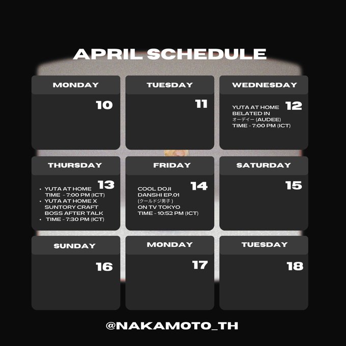 - YUTA at Home x Suntory Craft Boss After talk ติดตามผ่านทาง Twitter ของ @InterFM897 และ @_craftboss (7:30PM 🇹🇭)