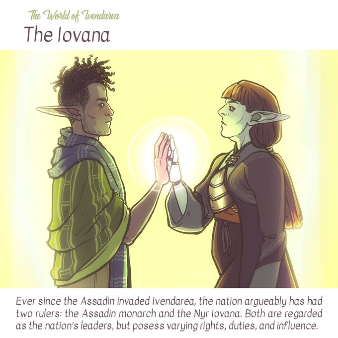 Ivendarea has 2 rulers currently: King Leoros, descendant of violent invaders, and Iovana Panmorn, the traditional leader of the Nyr. Both positions are different, not only based on their origins.