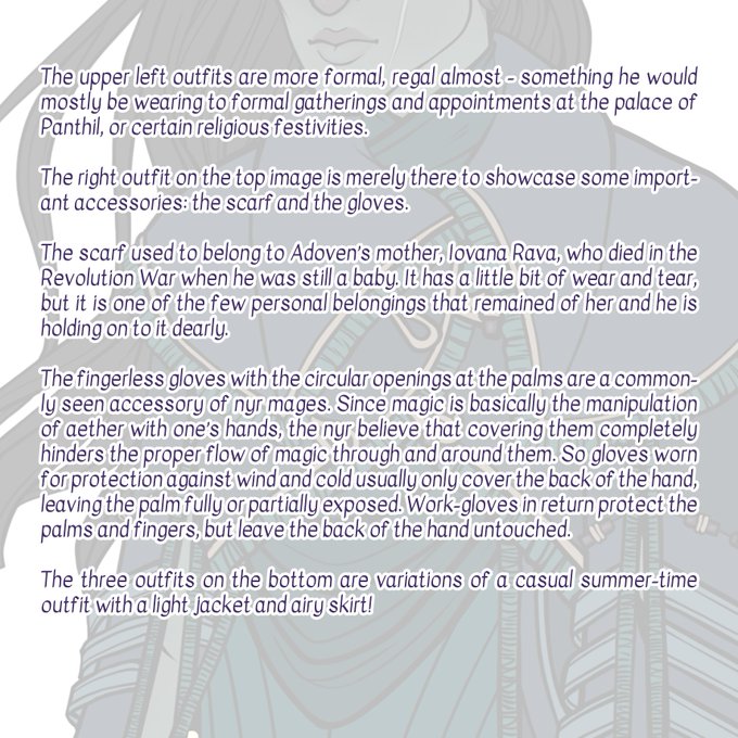 The continuation of Adoven's reference sheet! Today: formal wear, important accessories for mages, an heirloom, and summer outfits!