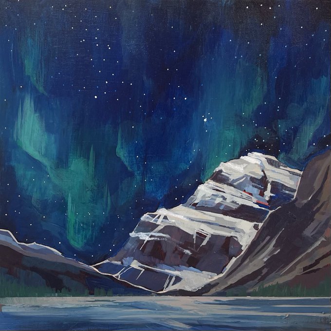 Taking a little moment of calm with this 12” x 12” painting of Edith Cavell and the Northern lights... visit https://t.co/Zg2wsHGRgI for more info! #yeg #yegart #northernlights #edmontonartist #nightsky #yeg #nightstars #edithcavell #jasper #jaspernationalpark #abmountains