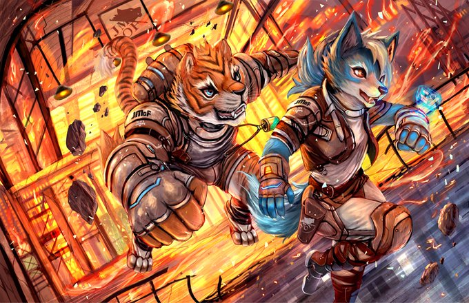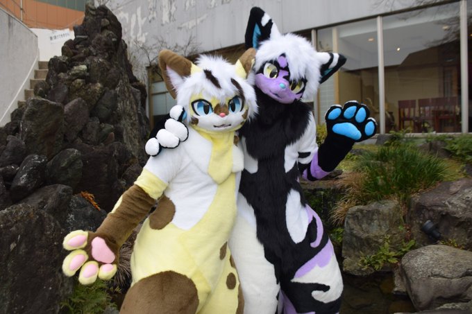 Spotti in Nanaba (yellow) with @RelayRaccoon at #JMoF2018 in suits and matching telegram sticker art (suits by @Kemono_LINE, telegram art by Cinnamon Spots @NLdraws) for #FursuitFriday