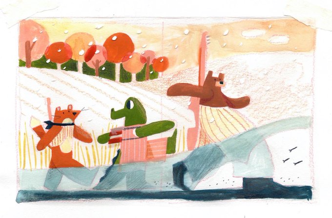 5: More finals! In this piece the band are quietly walking home, exhausted from their long winter of playing. More tomorrow! #childrensbook #childrensbookillustration #picturebook #picturebookillustration #kidlit #kidlitart #jontyhowley #theanimalsong #snappoomjinglejangle