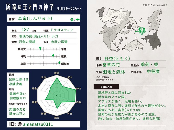 カジノ大国のトップディーラーの王様です。仕事はできるけど普段は夢見がちな普通のおっとり乙女です。セルフ血縁でキマイラのいとこがいますがそれ以外は何もないので仲良くしてください〜🤗🎰🎲