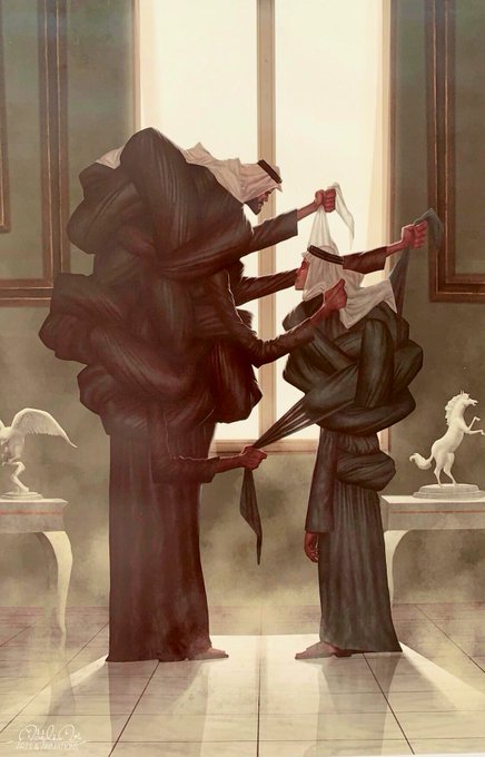 I was floored by this genius piece by @userseefbagshi made for @khaleejesque's "Breaking Khaleeji Cultural Myth" exhibit. It represents the passing down of social complexes, shown as literal knots (عُقَدْ), from father to son during this here all too familiar moment: