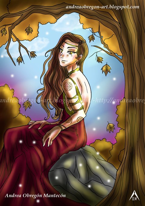 Llega el otoño, y esta joven se sienta bajo los árboles a contemplar el hermoso paisaje. En su brazo lleva varios símbolos: el “Lábaro Cántabro” y la “Espiral Celta”
