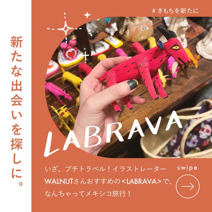 今回は、新たな出会いを探すため、メキシカン フォークアートショップ<LABRAVA>さんへ訪れました!おすすめしてくれたのは、イラストレーターのWALNUTさん✨