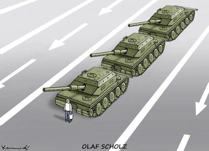 #Scholz antes del anuncio de enviar ¡¡14!!🥴 carros #Leopard 🇩🇪 a #Ucrania en la revista🇵🇱 @TygodnikWPROST y en las viñetas de @MarianKamensky1 y @Adamstoon1