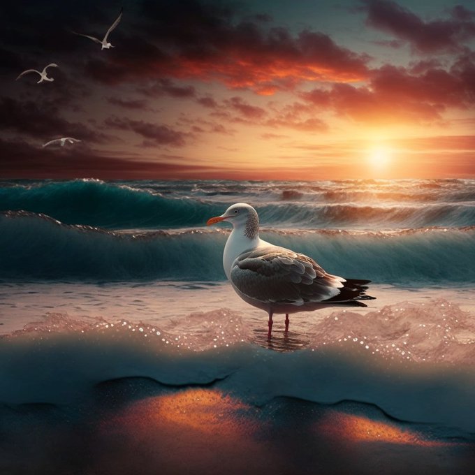 Bot: beautiful sunset over the ocean, waves, lone seagull