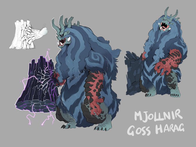 A Thunder element Goss Harag variant. His horns can create a magnetic field, allowing it to gather a large amount of rock and pebbles rich in iron, and shape them like a weapon. For some reason it prefers the shape of a hammer. #sunbreak