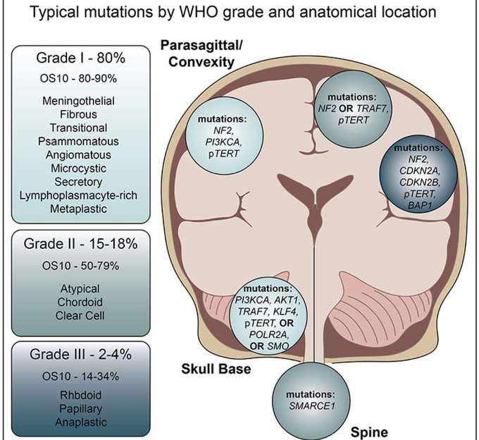 Students of #Neurosurgery: know your #meningioma presentation by location, histologies and WHO grades, most common sites of origin, Simpson grade of resection, NF2 & multiplicity, and be equipped to educate the team about genetics.