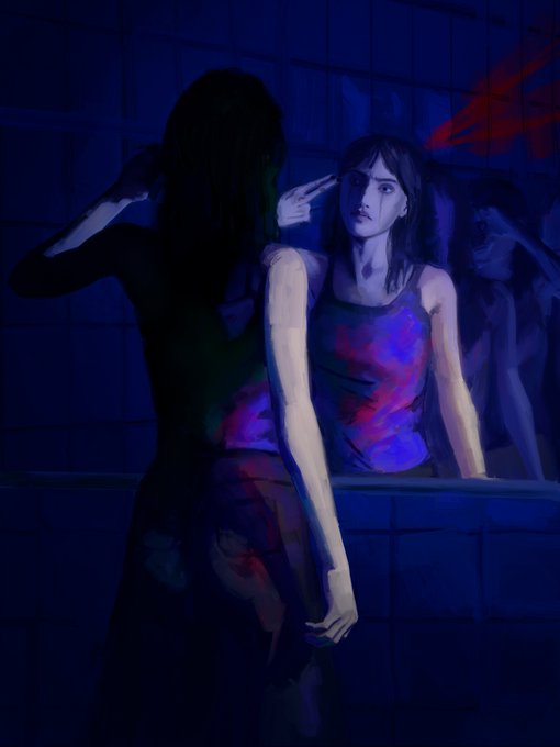 Focused eyes the colors magenta and Blues strike a vivid and mysterious painting