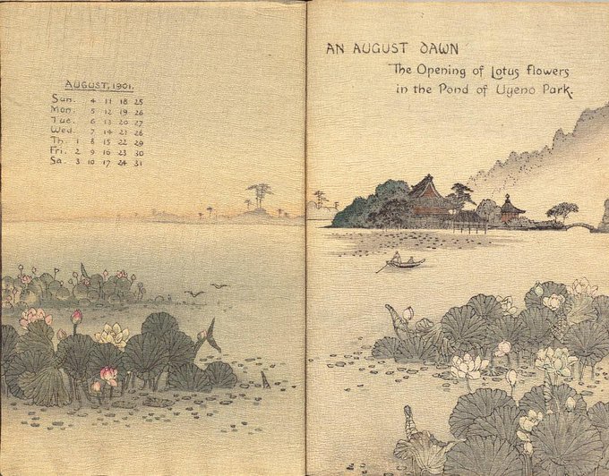 A 1901 calendar printed on chirimen (Japanese crepe paper), published by HASEGAWA Takejiro. You can enjoy the monthly changes of Japanese street scenes from 120 years ago! At that time, chirimen books were a popular souvenir of Japan. #ndldigital https://t.co/A6c2O8AygR
