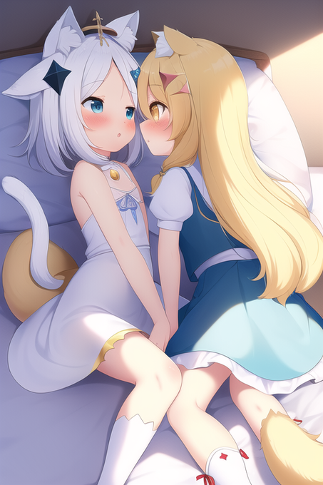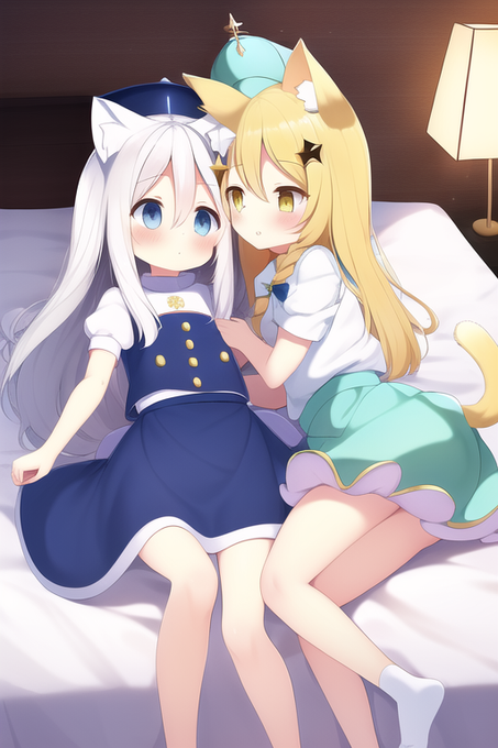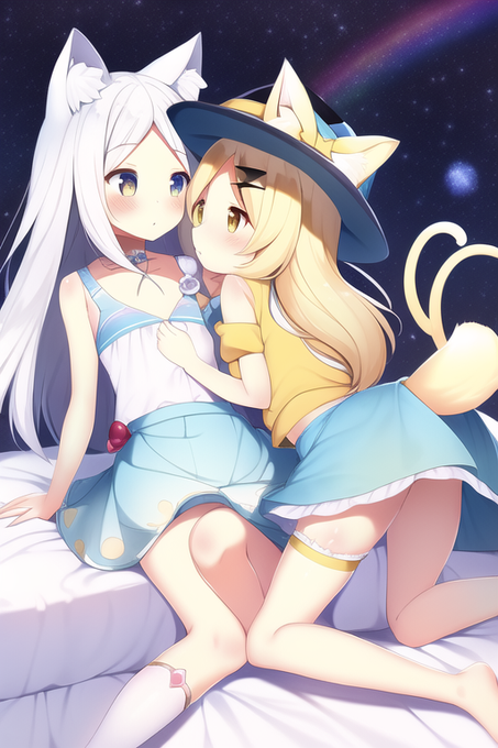loli,cute,masterpiece,small_chest,paimon,{{white hair}},milky way,[kirisame marisa],{rainbow},summer,light blue skirt,yellow hat,{{kemomimi}},nekomimi,tail,bed,yuri,two girls,{{white knee high}} #NovelAIDiffusion