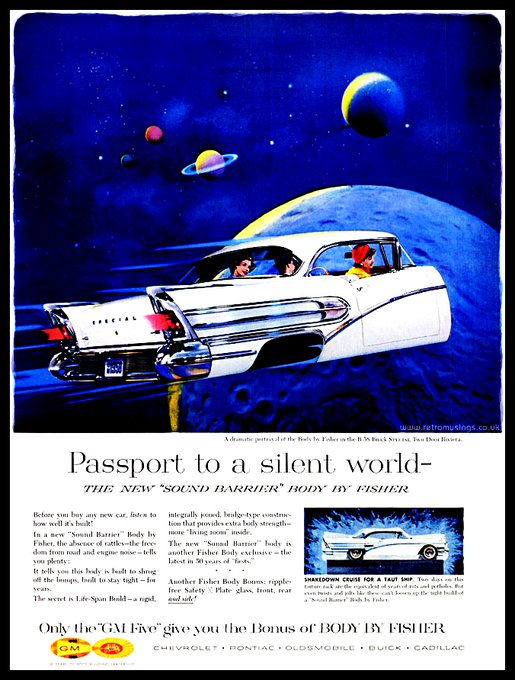 These space-age style ads for Fisher Body date from 1957-59 and are a collage of photo and illustration. Fisher Body, owned by General Motors, made automobiles for the likes of Chevrolet, Pontiac, Oldsmobile etc.