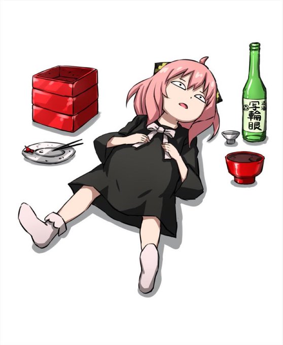 Anya eats too much Japanese New Year's food. Osechi cuisine is mainly food packed in stacked boxes. And in bowls is Zoni with baked rice cakes and other ingredients. And Sake is for the masses in 1800ml glass bottles.