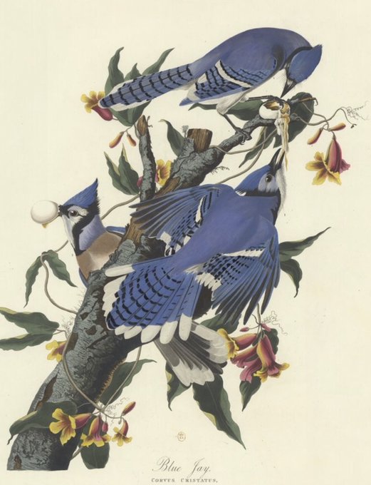Musique du soir : je vous emmène dans la Naples du XVIIIe siècle avec ce bijou de Jommelli, l’oiseleur, comme un ancêtre de Papageno, Mozart aimait beaucoup ce compositeur ! Image de @GallicaBnF, geais bleus, Audubon