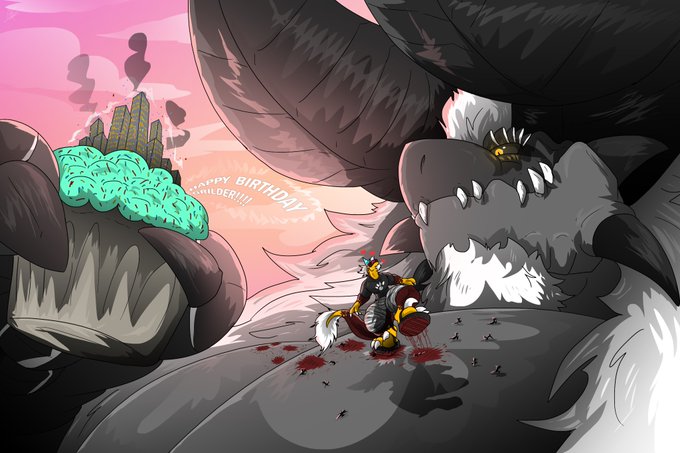 So me and Kill are celebrating it today. He's letting me stomp some micros on his big pecs and then Imma eat that big cupcake with all the smol peeps in it. <3