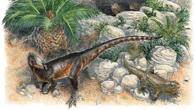 A proper Welsh dragon! Pendraig milnerae, a chicken-sized dinosaur who roamed the valleys of S. Wales 200 million years ago. She's now been named: pendraig = chief dragon; and for palaeontologist Angela Milner 🐉