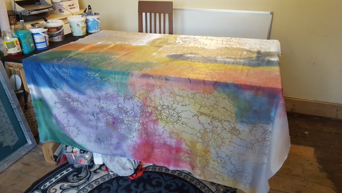 Decided to hand paint onto 100% pure #cotton layered with hand #Devored white #Silk and #viscose . Then coating it with #nanotechnology to make my #nanomask #ThePersonasofMehraj #Playoflight #TextileArt
