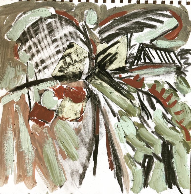 For lovers of square art, which neither belongs in the National Portrait Gallery nor the National Landscape Gallery, here are two ponderings with oil paints, bits of tape and soil, and a mere scribble of beech charcoal. Autumnal, heavy on the pink, and free to all scrollers.