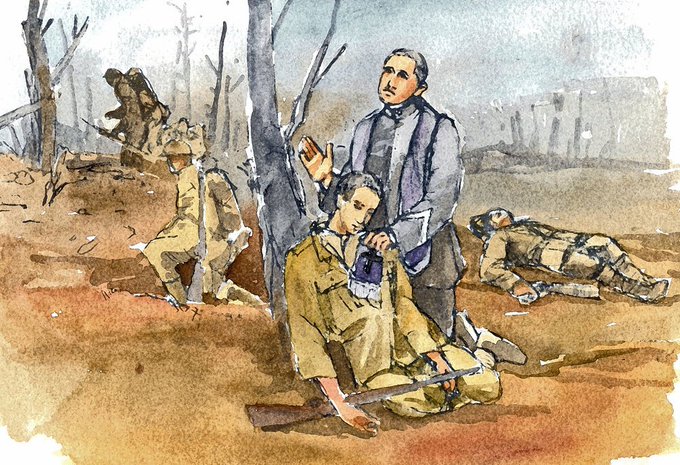 St. John 23rd, a chaplain during WW1, gives last rights to a soldier on the battlefield.