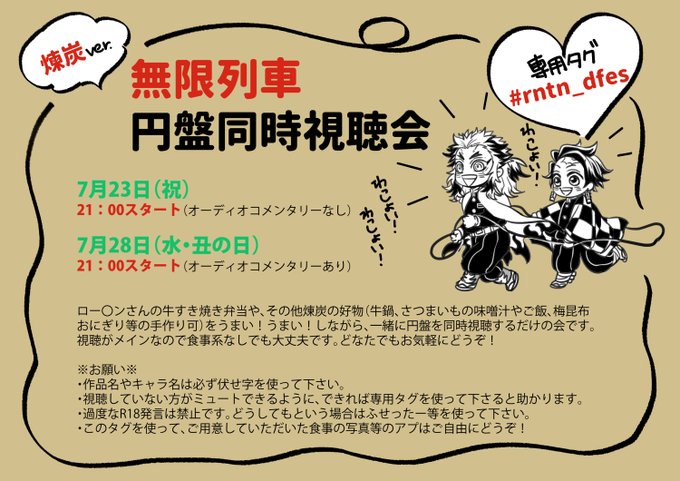 7月23日(祝)、7月28日(丑の日)の各21時から、煉炭の好物をうまい!うまい!しながら∞🚂円盤を同時視聴する会をします。TLで感想を呟きながら視聴するだけなのでどなたでも参加できます。