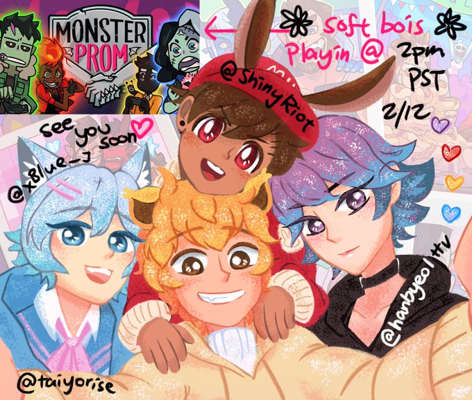 soft bois monster prom collab!! in 2 hours!! 💙💖💛💜 @xBlue_J @ShinyRiot @hanbyeolttv @taiyorise