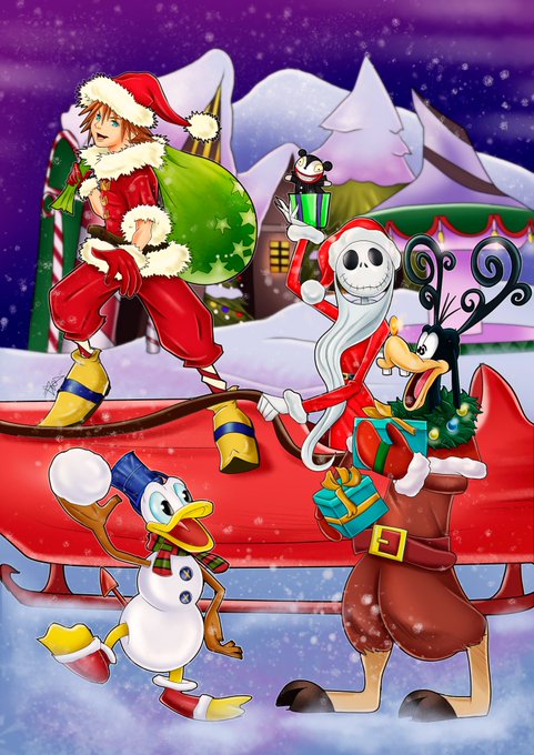 Here’s a Kingdom Hearts Christmas art with Sora, Donald and Goofy with Jack in Christmas Town!