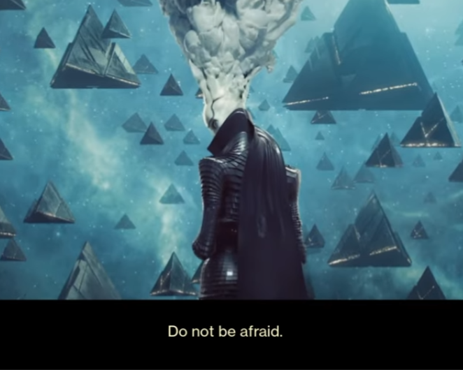 That's not all, these lines tell you everything you need to know -- [squeals] and this is the best part about the narrative team working on this, are you kidding me -- about Lightfall. They say everything in these four frames. The whole year! Risen, Haunted, Plunder, and...?