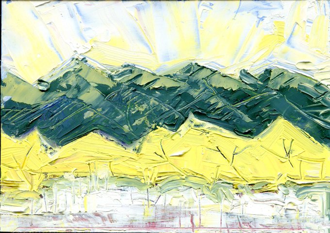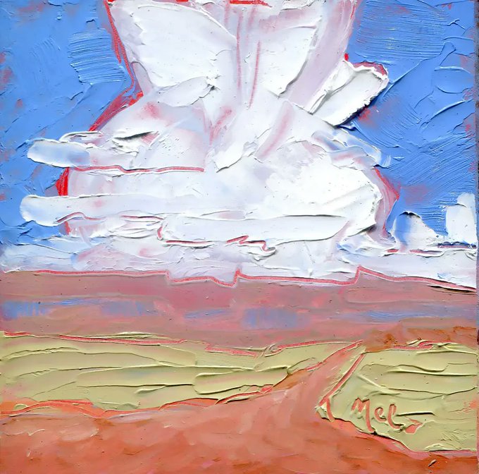 "Big Weather Ahead," oil on panel by Melwell, 4x4" Call Parsons Gallery of the West 575-737-9200 #traditionaltaosart #oilpainting #landscapepainting #parsonsgallery #taosnm #taos #taosartist