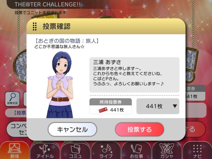 三浦あずささんへの「おとぎの国旅人役」1/13(日)9:02pm一斉投票です